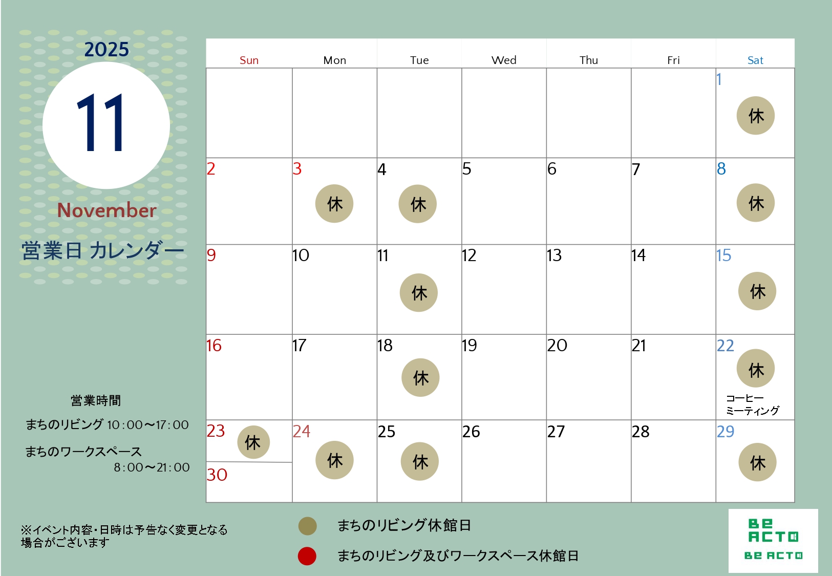 11月の営業日カレンダー